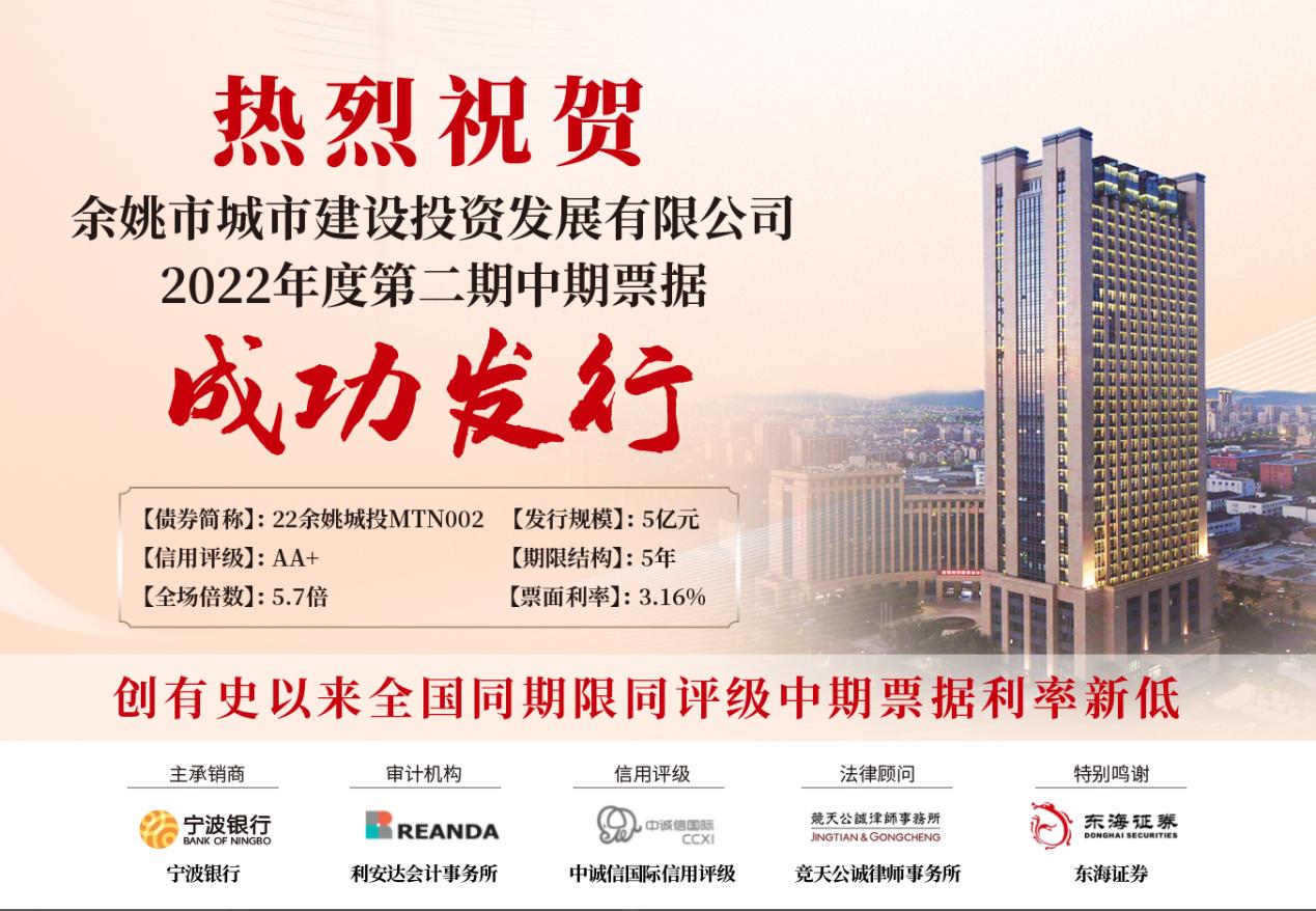 經(jīng)過半年的募集準(zhǔn)備、數(shù)據(jù)更新反饋、多方協(xié)調(diào)溝通,舜建集團下屬全資子公司市城投公司2022年第二期中期票據(jù)5億元于8月3日成功發(fā)行,期限5年,票面利率3.16%,全場認(rèn)購倍數(shù)5.7。