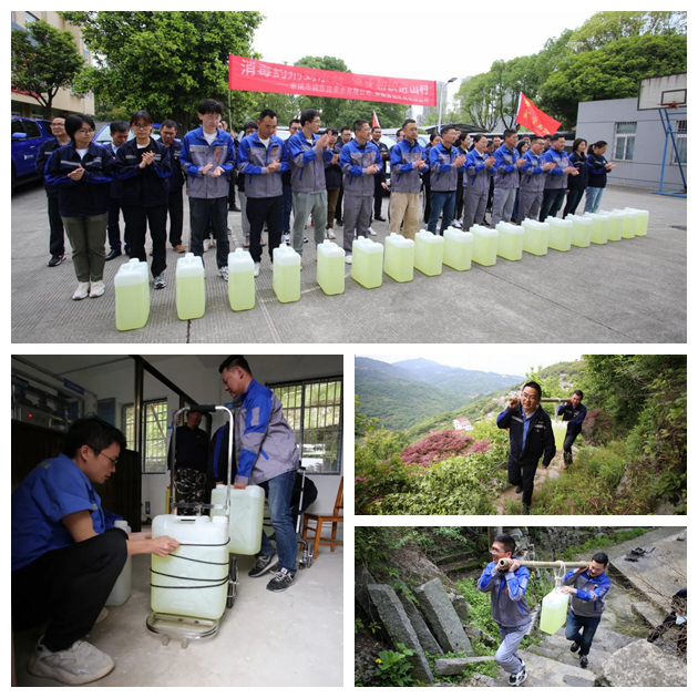 簡短的啟動儀式后,志愿服務(wù)車隊有序出發(fā),把30桶凈水消毒劑分別運(yùn)送至四明山區(qū)的三石里、棠溪、步梯巖、北溪等偏遠(yuǎn)水站。由于山路崎嶇陡峭,每桶藥劑重達(dá)30公斤左右,大家只能用小車?yán)㈦p人抬扛等方式配送,雖然累得氣喘吁吁、汗流浹背,但大家相互鼓勵、相互協(xié)助,齊心協(xié)力超額完成了當(dāng)天的配送任務(wù)。